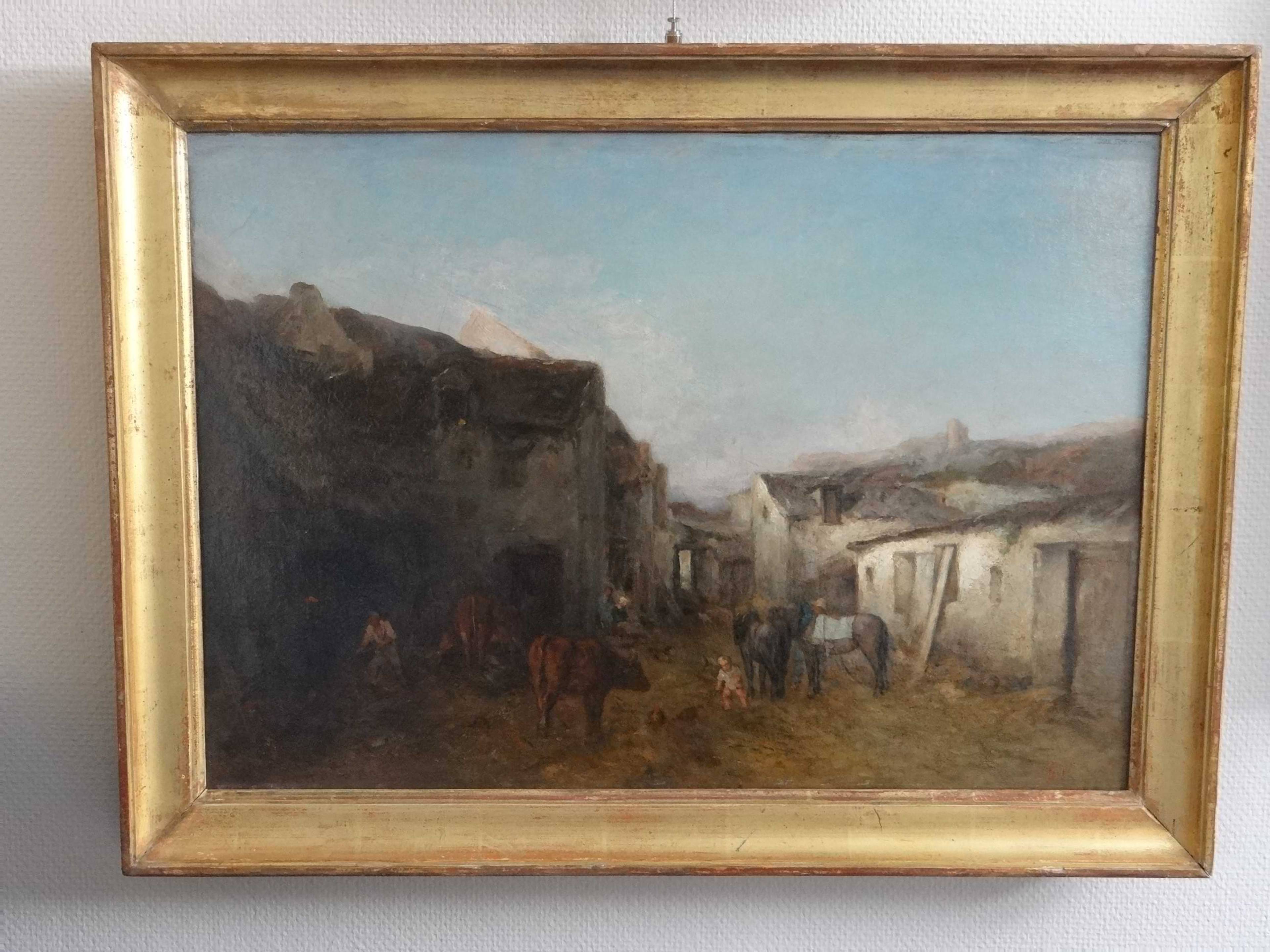 Dörfliche Bauernhofszene unter strahlend blauem Himmel