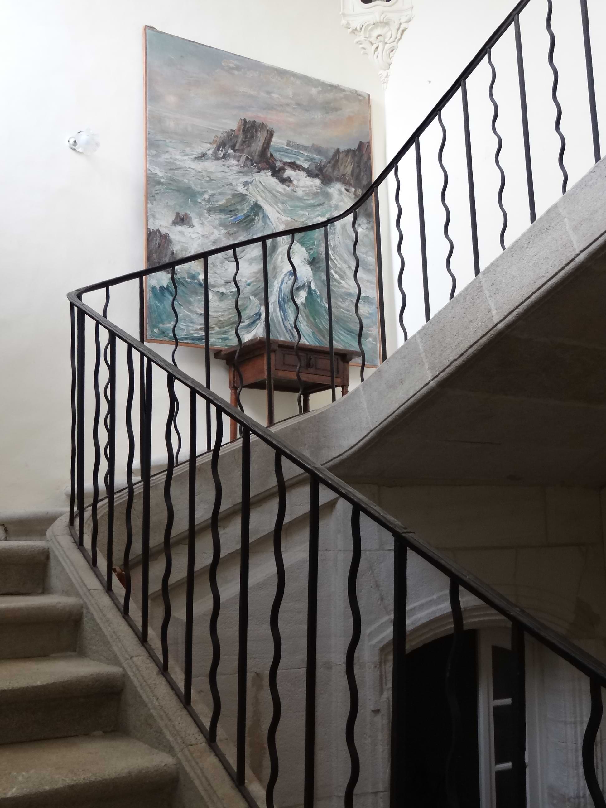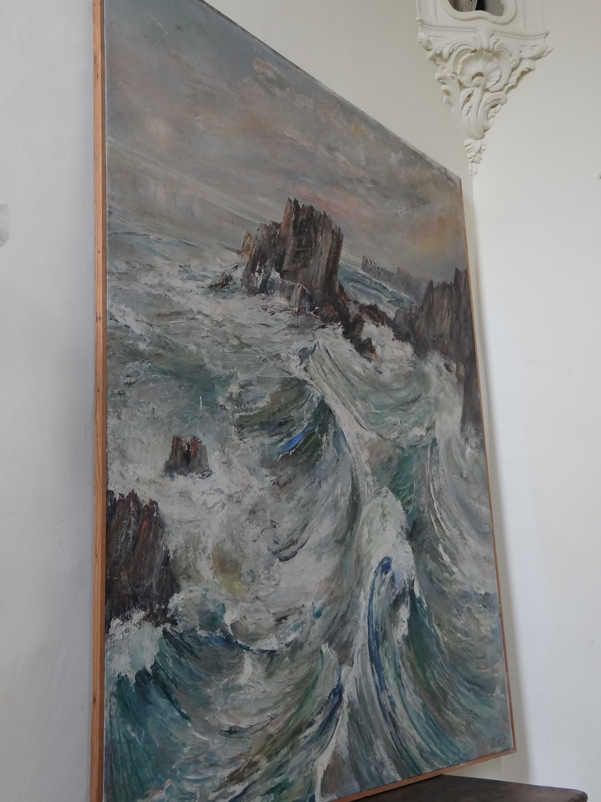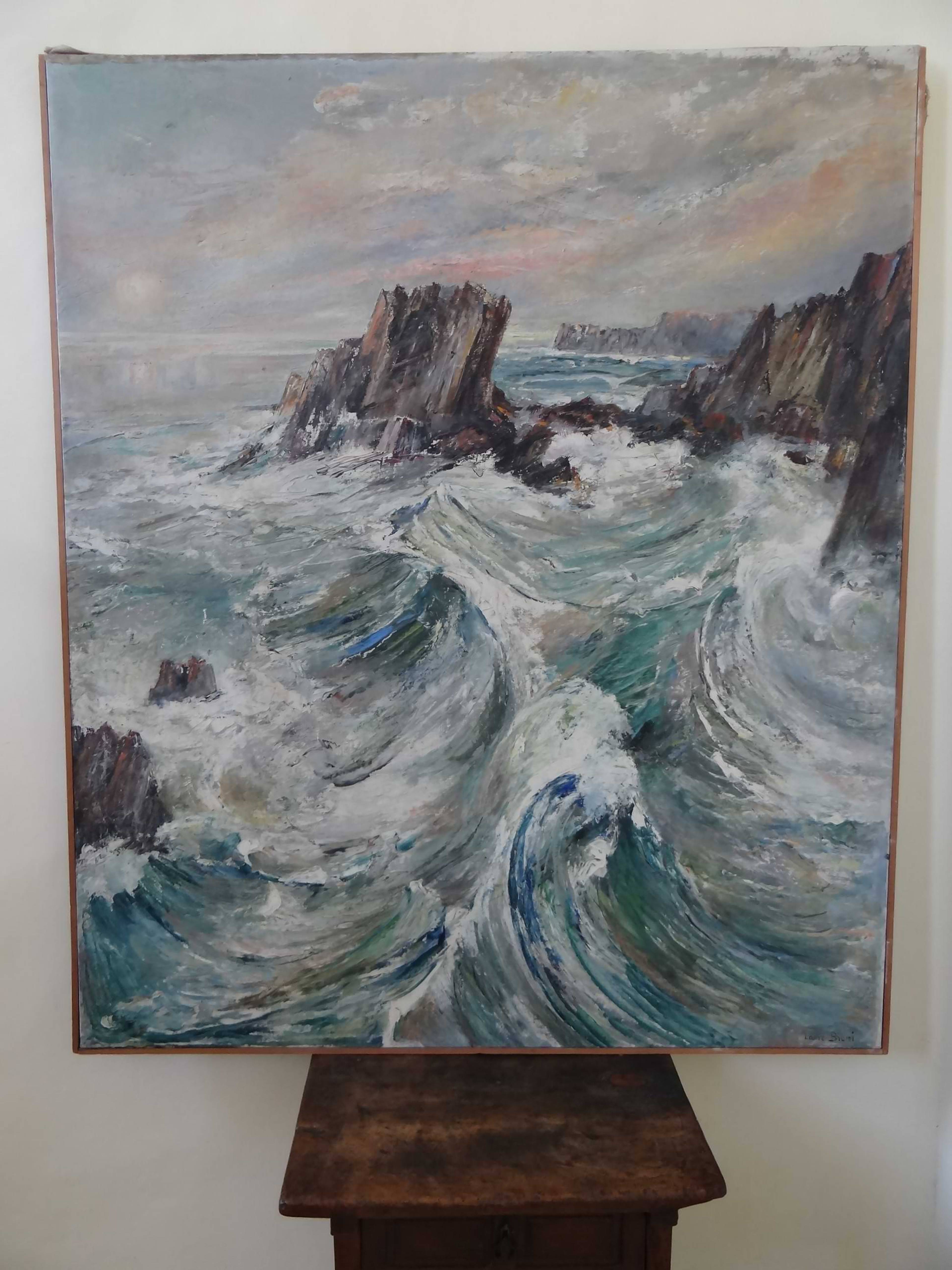 Majestätische Felsen und ein tosendes Meer mit starkem Wellengang bewirken die wilde Schönheit dieser großformatigen Meereslandschaft. Die stürmische See erzeugt gewaltige Wellen mit Schaumkronen. Das Wasser bricht sich an den Felsen und an der Steilküste und wird mit gewaltiger Kraft hin- und hergeworfen. Die Farben des Meeres gehen von blau über grün zu weiß in allen Varianten. In der Mitte und am rechten Bildrand dominieren die rauen, kantigen Felsen und die Steilküste. Die Gischt vermischt sich auf der linken Seite des Gemäldes mit den Farben des Himmels, während der stürmische Himmel rechts in ein Abendrot übergeht. Über der gesamten Szene liegt trotz des vorherrschenden Sturms viel Licht, das die Farben des Meeres leuchten lässt. Zudem erzeugt das Werk durch die dynamische Darstellung sowie durch den Farbauftrag mit einem Spachtel eine starke, positive Energie. Diese Kraft strahlt aus und man wird in seinen Bann gezogen. Angaben zum Zustand der Werke und weitere Fotos auf Anfrage.