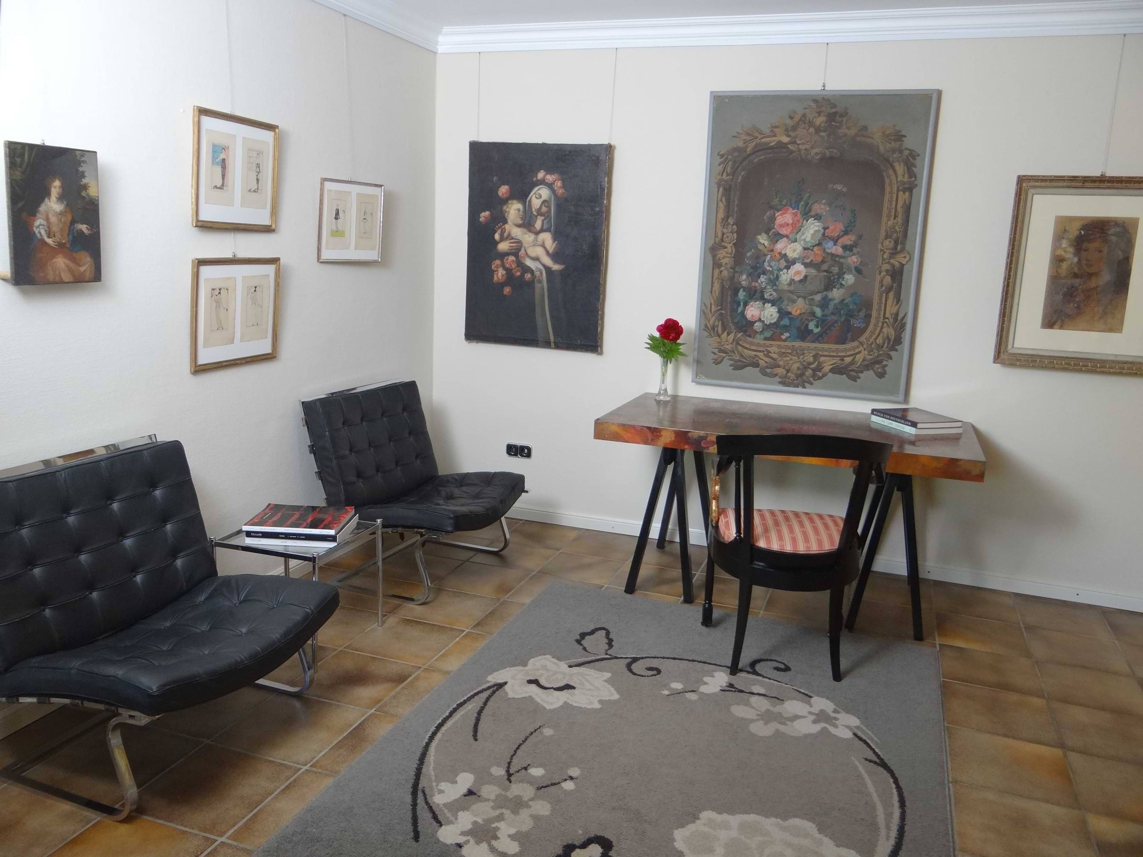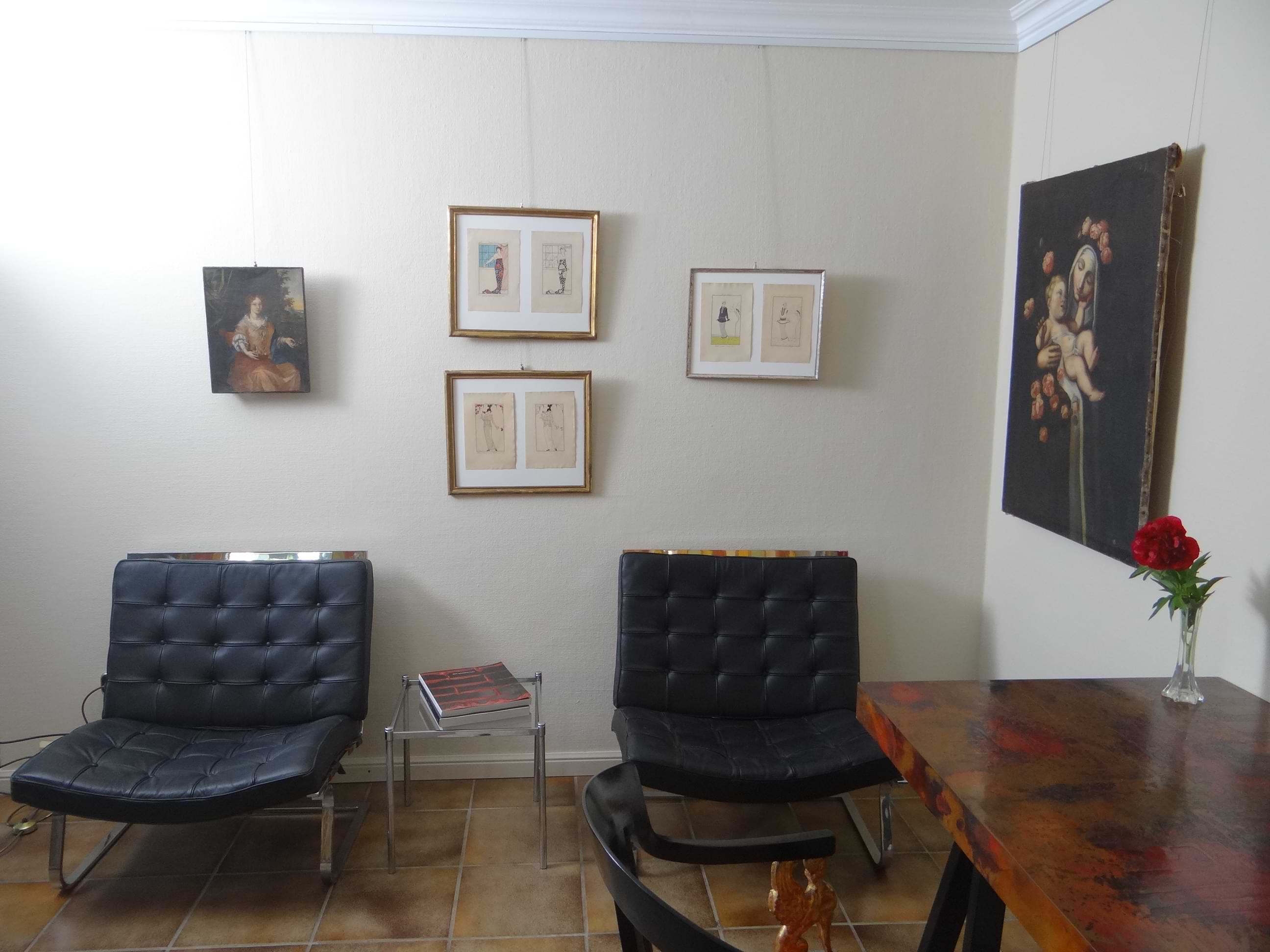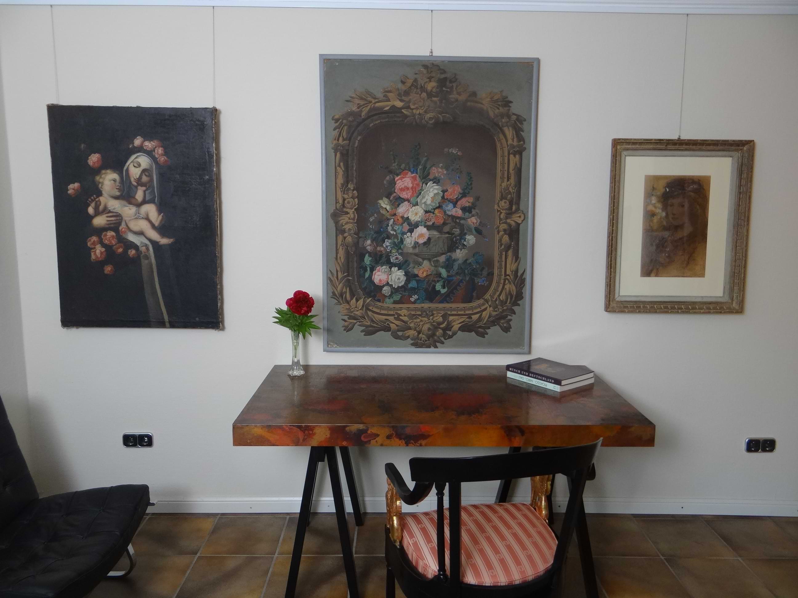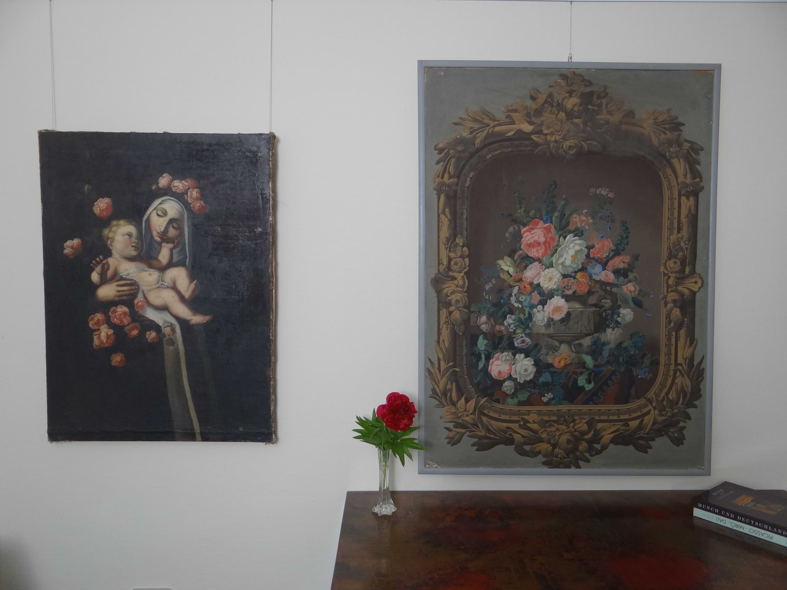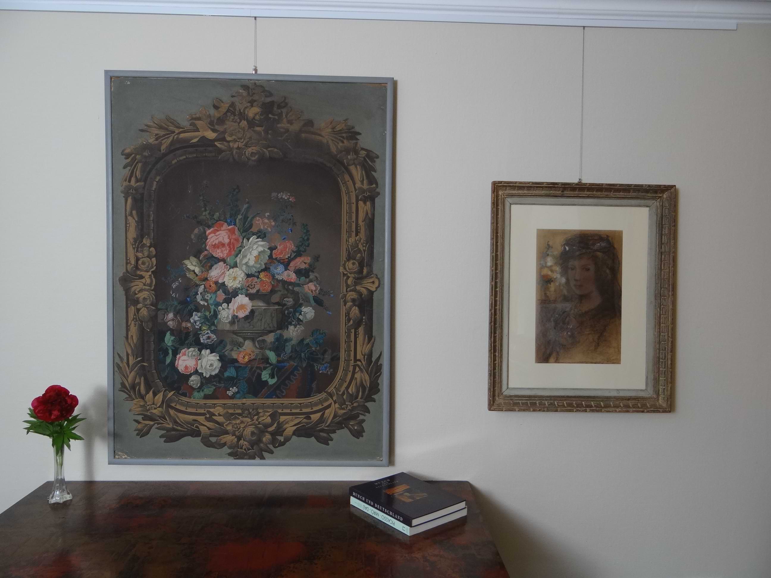 Rosen haben seit jeher eine ganz besondere Bedeutung. Sie sind insbesondere Symbole für Schönheit, Reinheit, Klarheit und Liebe. Zudem sind die Blüten mit ihren vielschichtigen Blütenblättern sehr dekorativ. Wegen der Symbolik und der dekorativen Wirkung werden Rosen gern in der Kunst und der Mode verwendet. Dabei dominieren die Rosenfarben rot und rosa. Der Name der Farbe Rosa wird in vielen Sprachen von der Rose abgeleitet. Insofern wird bei der Verwendung der Farbe rosa in einem Gemälde auch auf die Rose und damit auf deren Symbolik verwiesen. Die Darstellung der portraitierten Dame im rosa Kleid nimmt daher Bezug auf ihre Schönheit, Reinheit und Klarheit. In dem Gemälde, das die peruanische Heilige Rosa von Lima abbildet, gibt es eine Vielzahl von rosa Rosen, manche auch noch in der Knospe. Auch Rosa von Lima wird so mit den Attributen der Rose belegt. Im Portrait des Mädchens wird die rosa Blütenfarbe benutzt, um Sensibilität und Zartheit auszudrücken während in den Modestichen die Verwendung der roten Rose für Leidenschaft und Energie steht. Das überaus dekorative Papier Peint verwendet die rosafarbenen und weißen Rosen hingegen im rein dekorativen Sinn und bedient sich der prächtigen Wirkung, für die die Rose auch stehen kann. Angaben zum Zustand der Werke und weitere Fotos auf Anfrage.